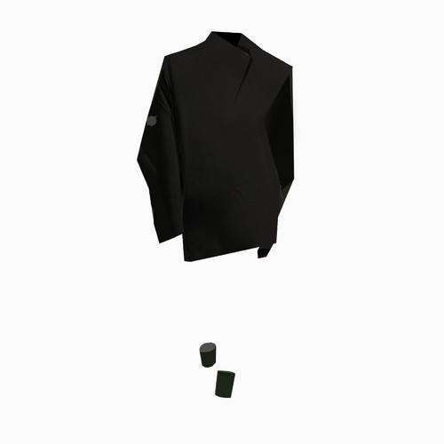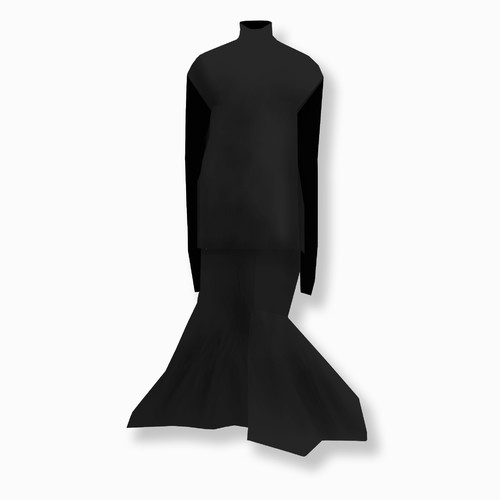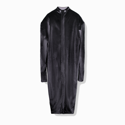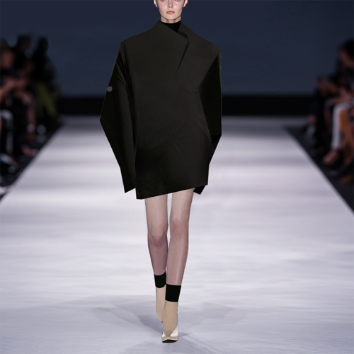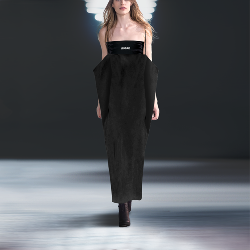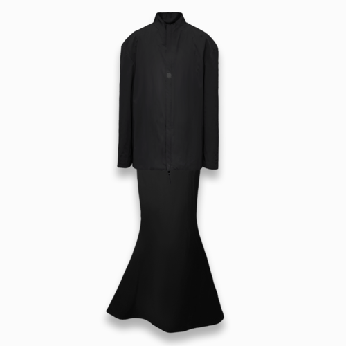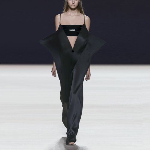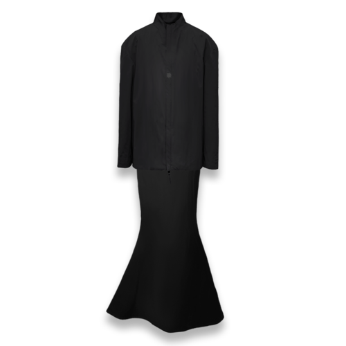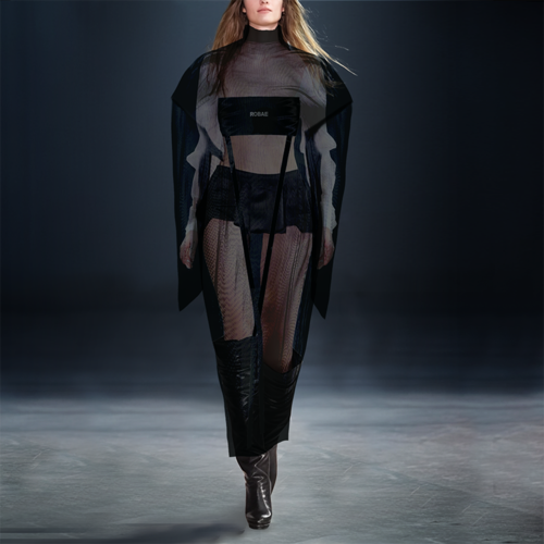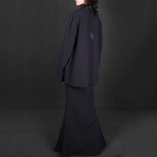 ROBAE科学家系列的设计灵感,源自《他的外套》主题。黑色,神秘且高雅,科学家黑色系列探索时装美学与工装主义的界限,诠释实验符号美学与浪漫基因。将实验室工装的特殊功能性与高定时装的艺术性组合,加以经典黑鸟星立体印花标志,轻盈质感、功能面料与正装剪裁。立领、展肩,长衣袖与中长设计结合下装鱼尾裙浪漫设计,打造品牌经典“实验工装”风格。浪漫经典。
