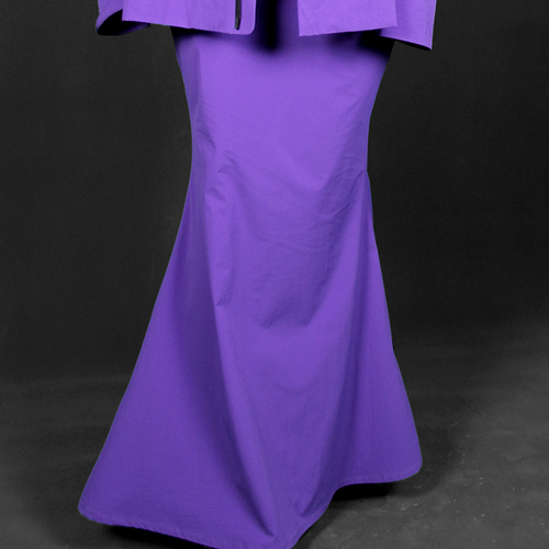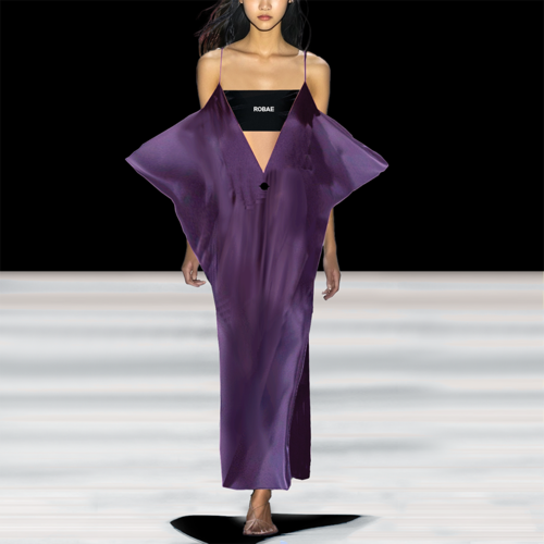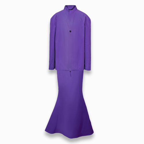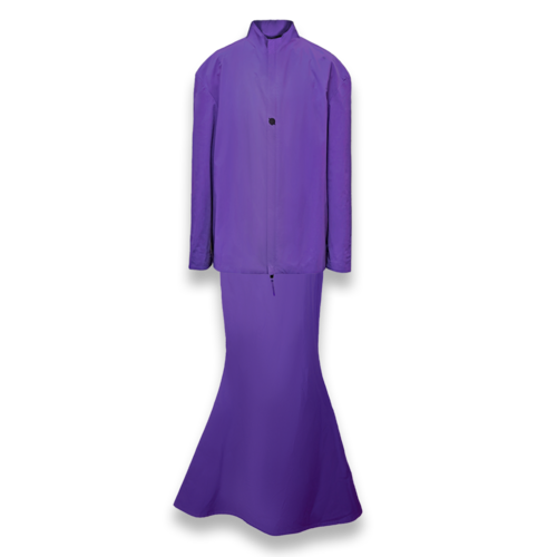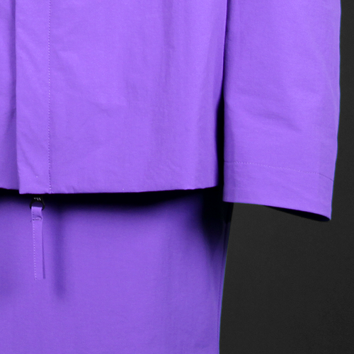 ROBAE科学家系列的设计灵感,源自《他的外套》主题。科学家紫色系列探索实验符号,色彩美学与浪漫基因、时装美学、色彩与工装主义的完美组合,紫色与黑鸟星标志着实验室工装的特殊功能性与高定时装的艺术性别样结合。轻盈质感、功能面料、正装剪裁、立领、展肩,长衣袖与中长设计结合下装鱼尾裙浪漫设计,打造品牌经典“实验工装”风格。严肃且浪漫。