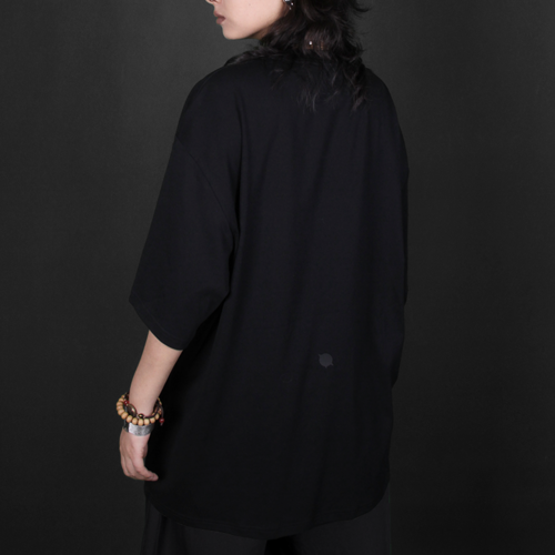 ROBAE为限定成衣注入了第一层“生命皮肤”,灵感源自象征优雅与礼仪的领结文化,不仅代表着严肃与经典,更传递出对场合的尊重与对细节的重视。T恤以“黑鸟星”标志替代领结,展现独特的优雅与浪漫。精选神秘黑色重磅超柔棉,兼顾了立体挺阔和肤感柔软。阔肩宽松版型结合环领设计,适配多元场景;散口中袖与中长平直下摆增强动态穿着自由度,将舒适体验与精致风范巧妙融合。黑色T恤配以黑色立体印花标志,重新演绎低调经典与高级审美,章展现低调优雅的气质。