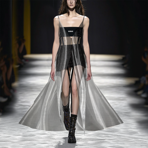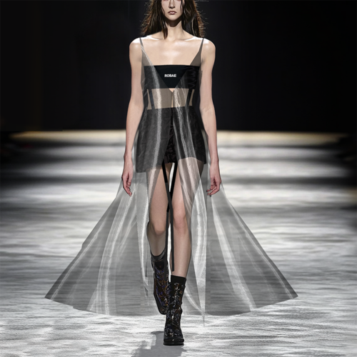 ROBAE Aeswisp光之精灵系列 《灰蝶》主体从浪漫的镜头瞬间为灵感,结合灰蝶的自然浪漫、婚礼服的美学、工装的背带与时装裁剪,创作关于爱、绚烂、勇气的故事。系列探索实验工装符号,色彩美学与浪漫时装美学、礼服与工装主义的跨界组合,黑鸟星背部标识,体现着高定时装的叙事美、艺术美誉与星徽时刻。设计集中于腰部的誇张形体感,拉高身体完美比例与戏剧化,展示女性美。自然宽松且舒适。